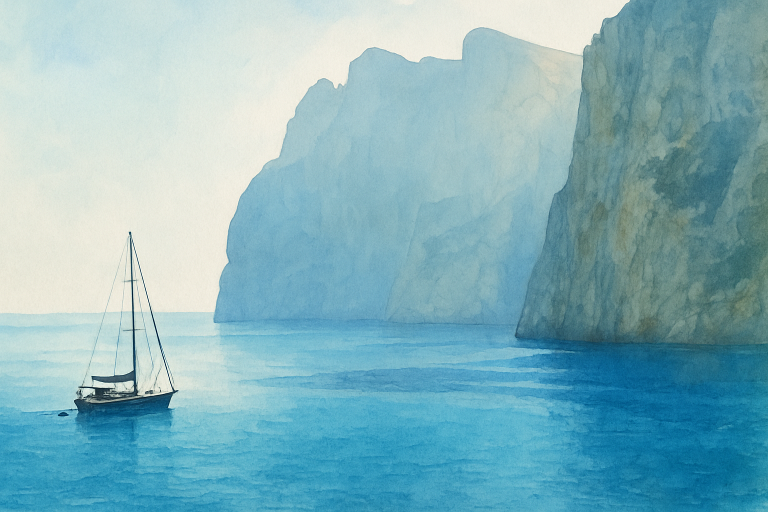 Color & Package: Deep Teal Blue. Watercolor illustration of the deep Mediterranean Sea and a yacht.