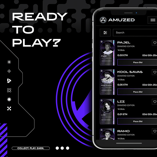 I developed a series of promotional graphics focusing on the "Diamond Edition" artist drops and the core gameplay loop ("Ready for a new game?"). By utilizing the brand's signature neon violet palette and dark-mode aesthetic, I created a cohesive set of marketing visuals that highlighted the app's interface while maintaining a sleek, futuristic look suitable for Instagram and Twitter campaigns.